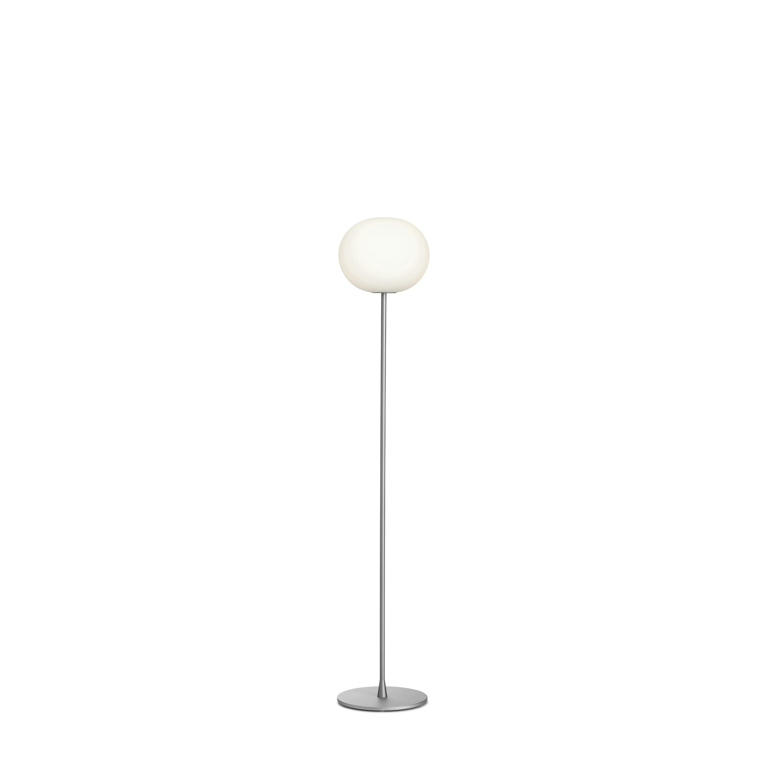 Floor lamp providing diffused light. Diffuser consisting of an externally acid-etched, hand blown, flashed opaline glass and a die-cast threaded ring nut with alodine plating finish. Gray or black painted high-thickness steel base and stem and die-cast aluminum diffuser support. On the cable there is the electronic dimmer which allows the regulation of light brightness.