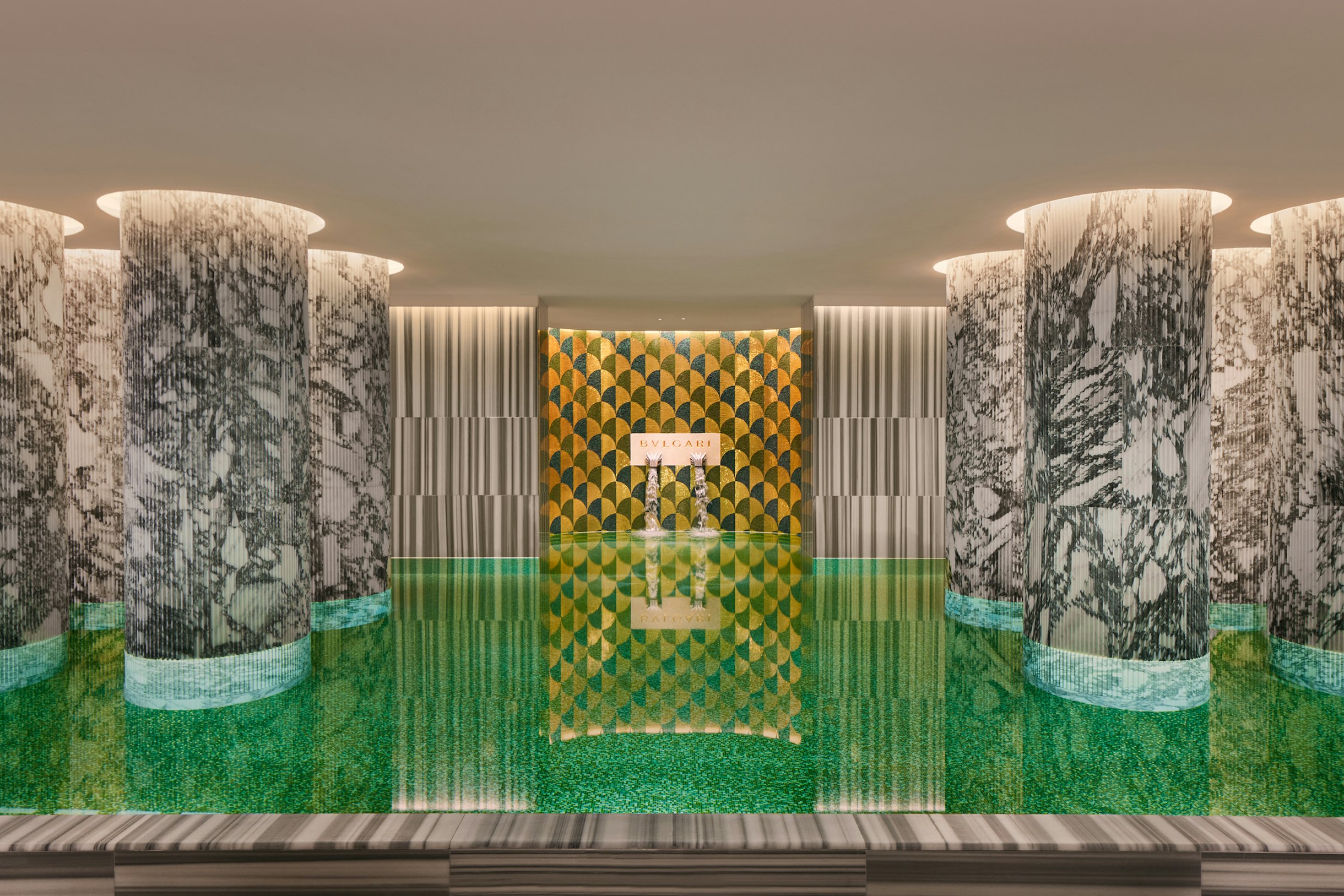 Designed around large blocks of colour to evoke Bvlgari’s renowned jewellery creations, four distinct colour schemes grace the hotel rooms, with the choice of coloured marble in the bathrooms dictating the overall palette. For the first time in its history, the iconic Arco lamp by the Castiglioni Brothers is transformed as the original Carrara white marble base is replaced with a marble to match the colour scheme of each room.